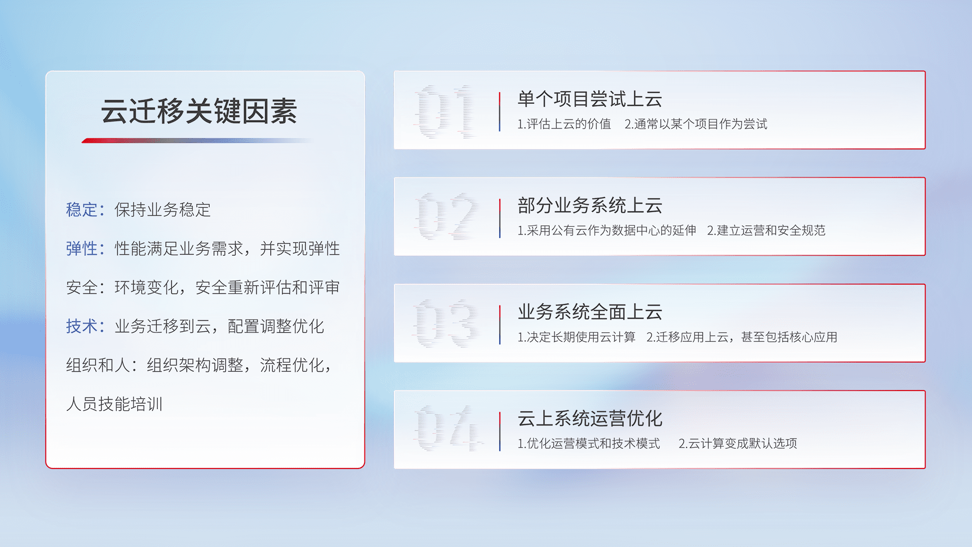 结合实际业务,,,从规划设计、、云平台选型、、云原生改造、、数据迁移、、、、集成交付,,迁移全过程为客户识别最佳上云路径,,,做好风险识别管理,,,设计网络架构、、、身份权限、、、、安全审计合规、、操作审计、、、日志审计、、监控告警策略、、多站点容灾设计等,,,,对云上基础设施进行整体规划,,,提升IT治理水平,,以满足弹性、、、高可用、、高性能的需求。。