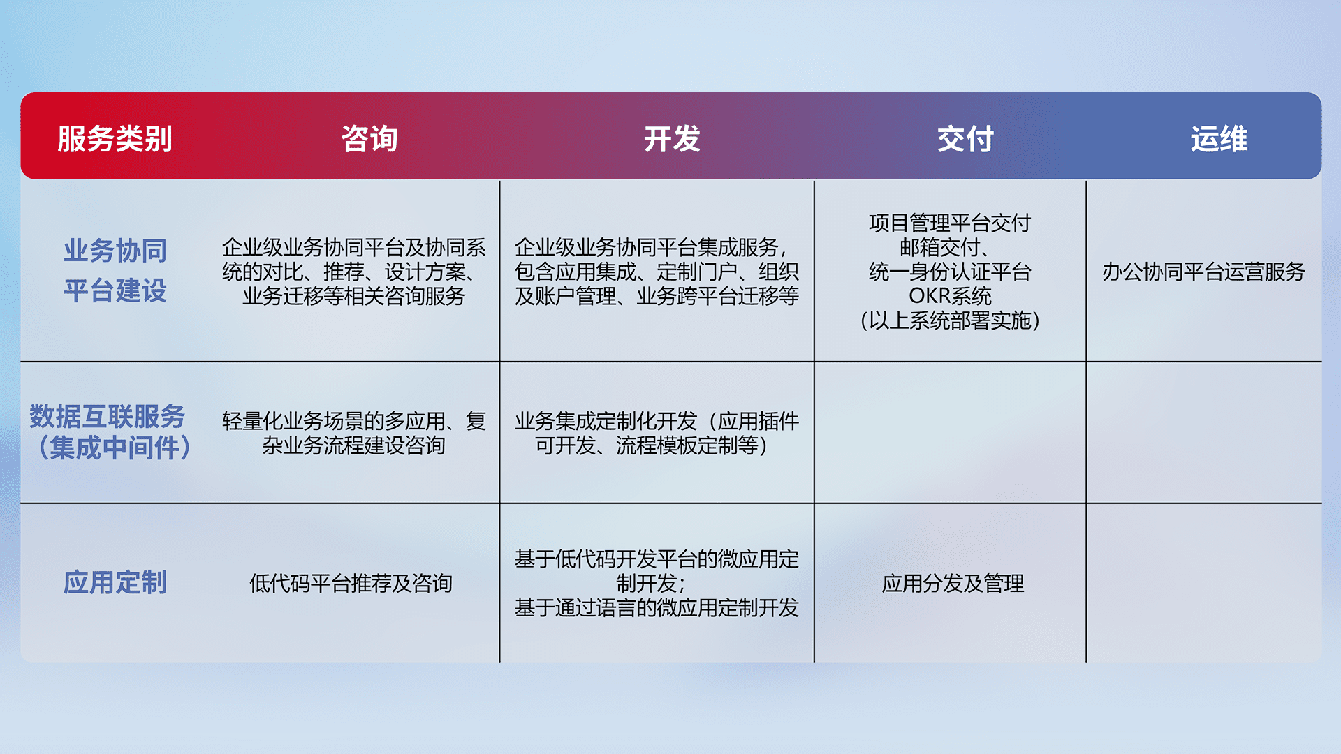 针对钉钉、、、、企微、、IDaas等平台级产品提供产品的规划、、、方案、、、交付、、、定制化开发等服务,,,实现如统一协同办公、、智能客户服务、、、、混合会议管理、、、、智能数据查询、、等业务场景,,实现数字化转型。。